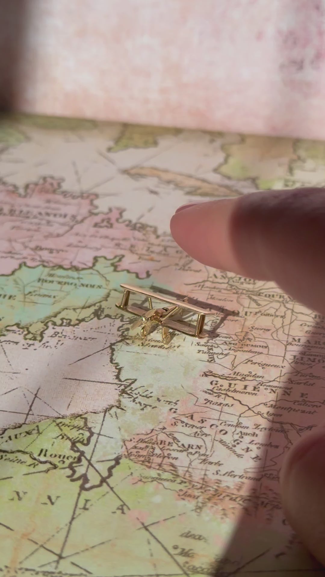 This delightful vintage biplane charm features a spinning propeller that captures the magic of flight. The wings serve double duty as a bail, allowing you to loop a chain through for a one-of-a-kind presentation.