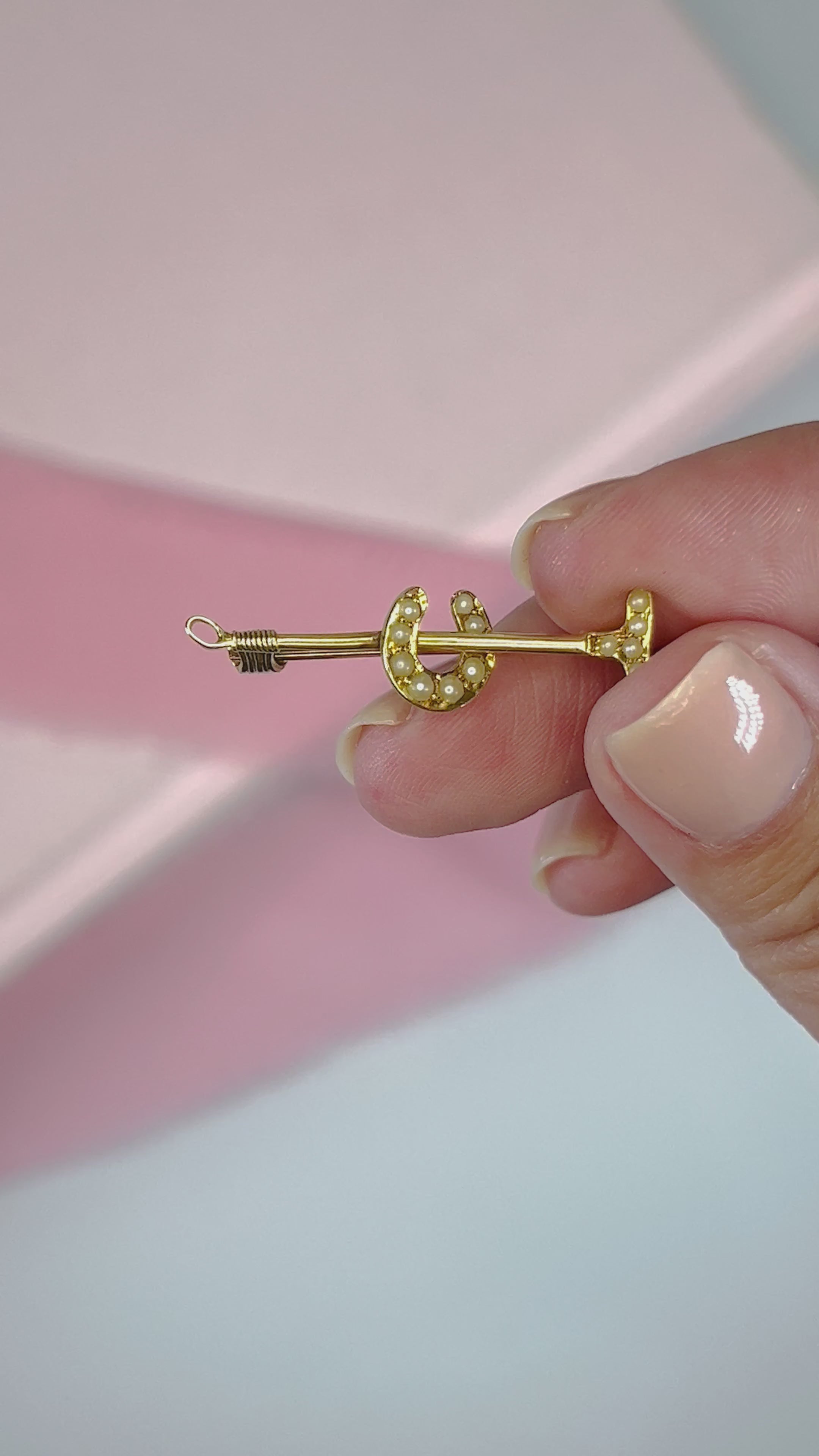 Spoil the equestrian lover in your life with this exquisite Victorian Polo Mallet and Horseshoe Pearl Brooch. The dainty size and easy-to-wear design make it a versatile accessory for blazers, sweaters, or even t-shirts. A delicate mix of nostalgia and Victorian style, enhanced by 13 tiny seed pearls for a touch of old-world elegance and luck.