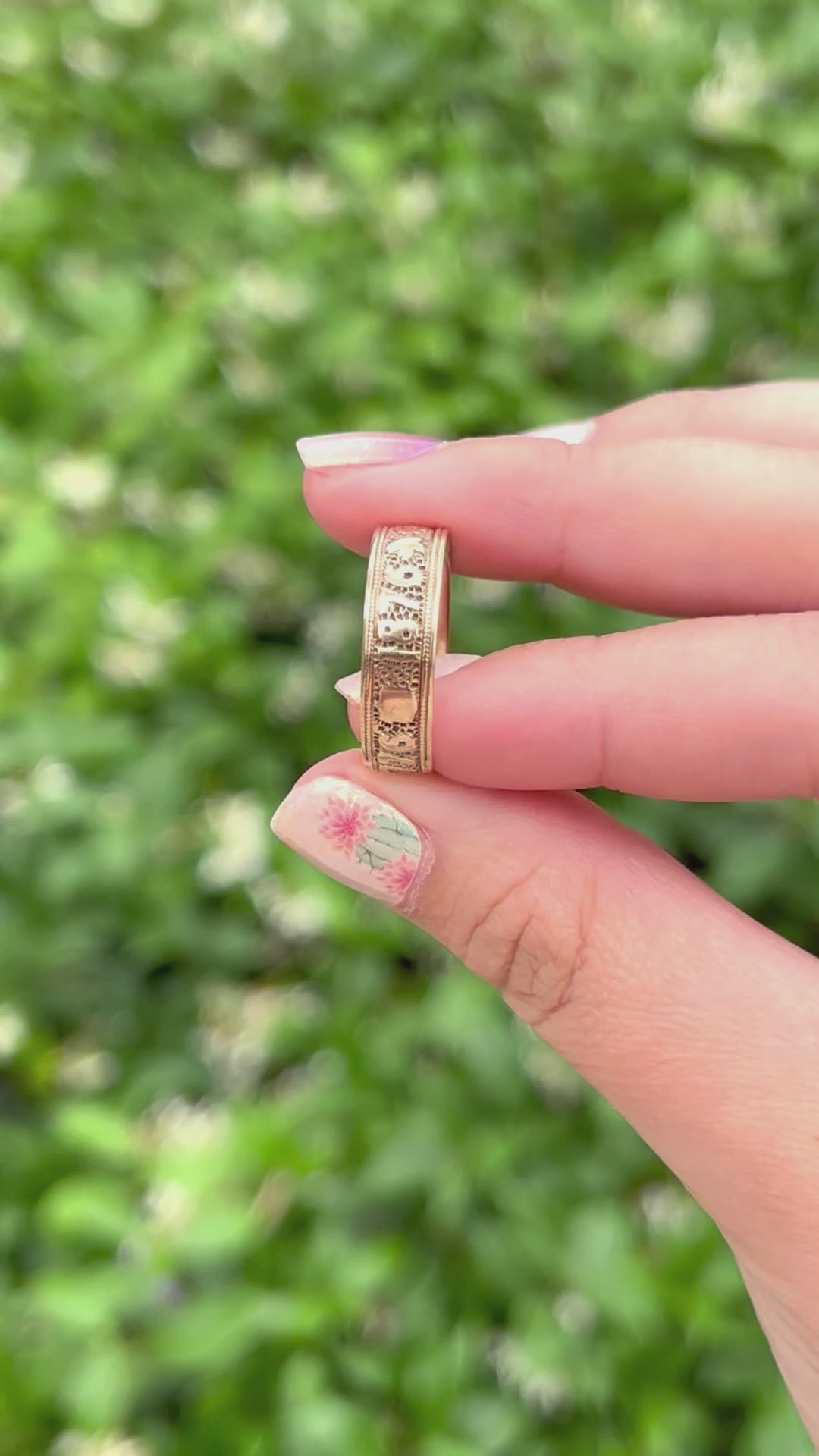 This antique ring celebrates 100 years of the Declaration of Independence with the years 1776 and 1876 on each side. It was sized, somewhere along its 147 years of life. The solder line is next to the “1” on the 1776 but it is not easily seen.