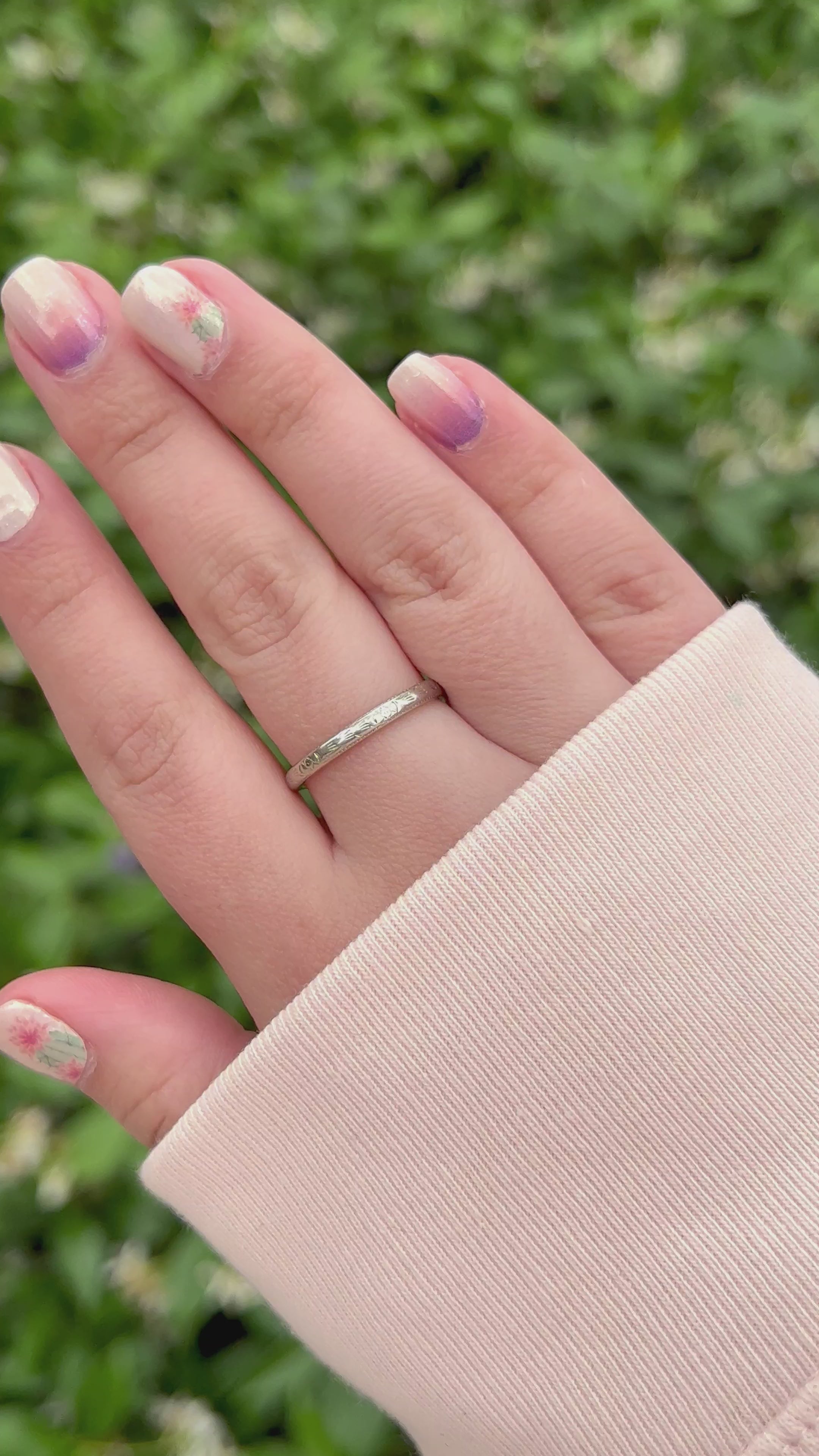 This gorgeous JR Wood eternity band is a rare find! Its white and yellow gold design features a unique worn orange blossom pattern, making it a timeless piece of jewelry with a story. Perfectly rounded for all-day comfort, this vintage ring holds a romantic inscription of "R.J. to M.V."