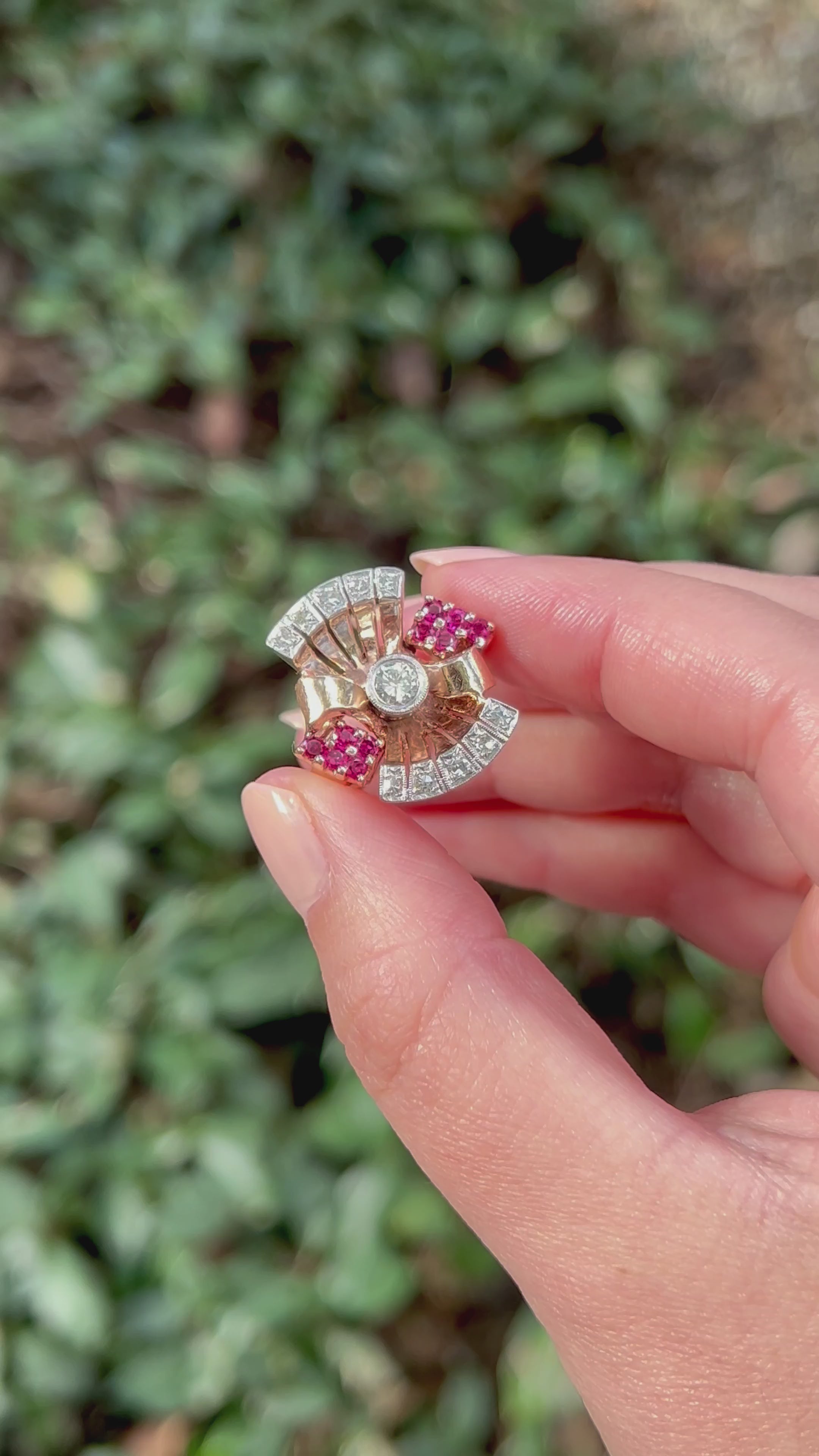 Experience timeless elegance with this retro rose gold and palladium ring. This vintage piece, dating back to the 1940s, features a stunning combination of 10 natural rubies and 10 single cut diamonds. The center stone, an early round brilliant diamond, adds a touch of sophistication. Plus, this ring is easily sizable.