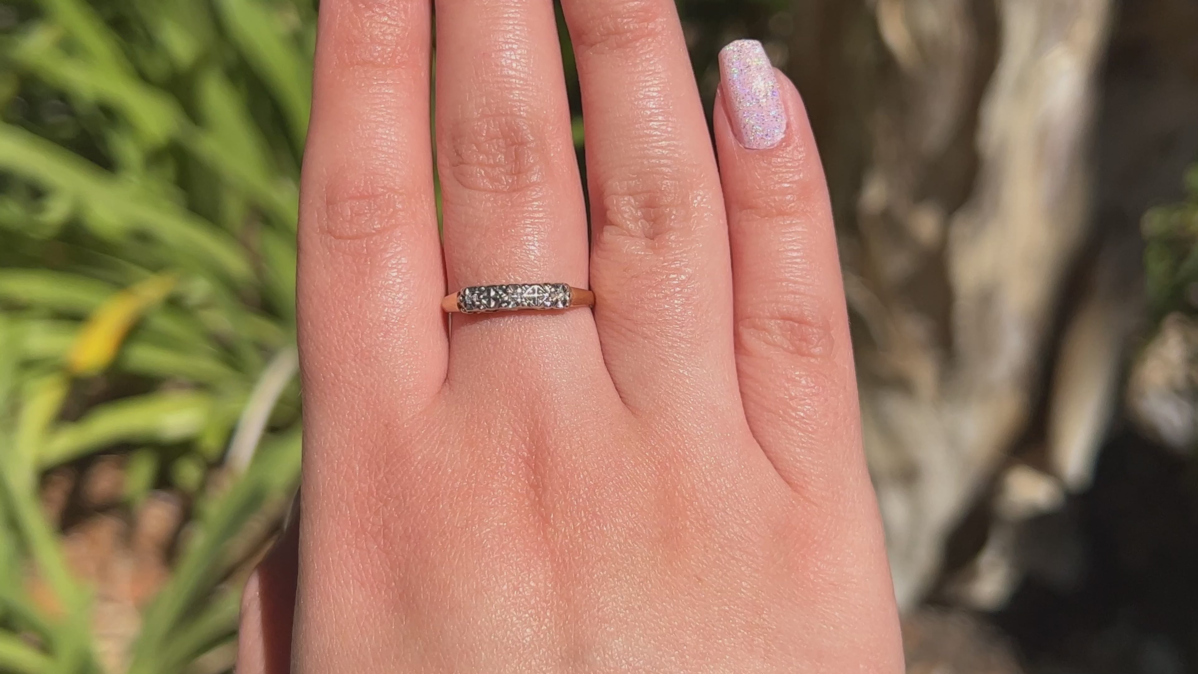 This exquisite ring is set with three single cut diamonds, providing a beautiful sparkle. The diamonds are professionally tight and ready for wear! The vintage two-tone design has a triangular pattern between the diamonds, adding an extra element of femininity and charm to this band. The front panel is made from 14K white and yellow gold, whereas a shank section on the back tests 10K probably due to a previous sizing event. This design takes classy sophistication to a whole new level while retaining timeless appeal. Don’t wait - get this gorgeous piece now!