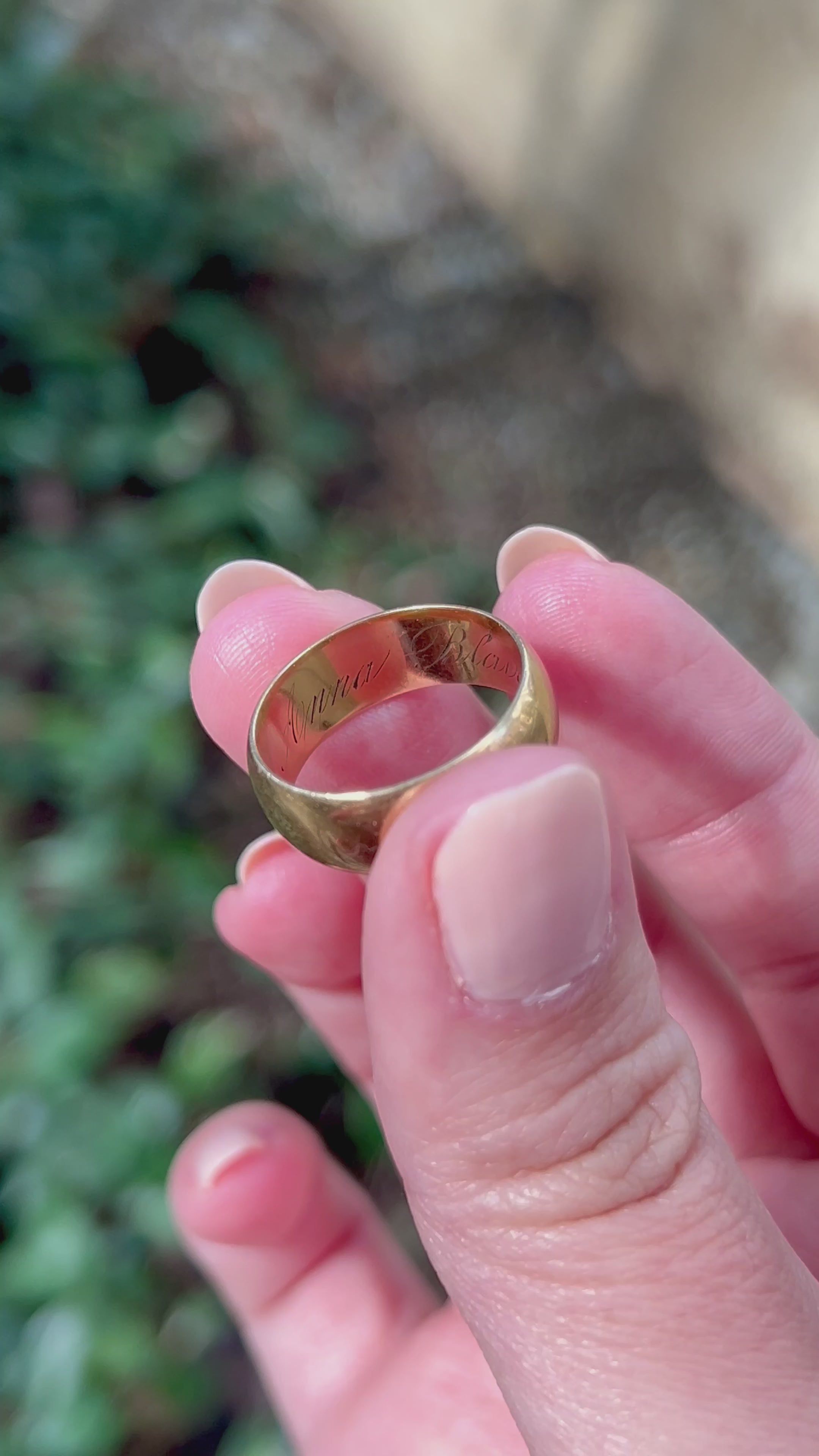 Step into the world of sentimental jewelry with this classic Victorian gold band featuring a rich patina. This antique piece boasts a beautiful inscription that reads "Anna Blair Sept. 28 '77," making it the perfect accessory or unique gift.