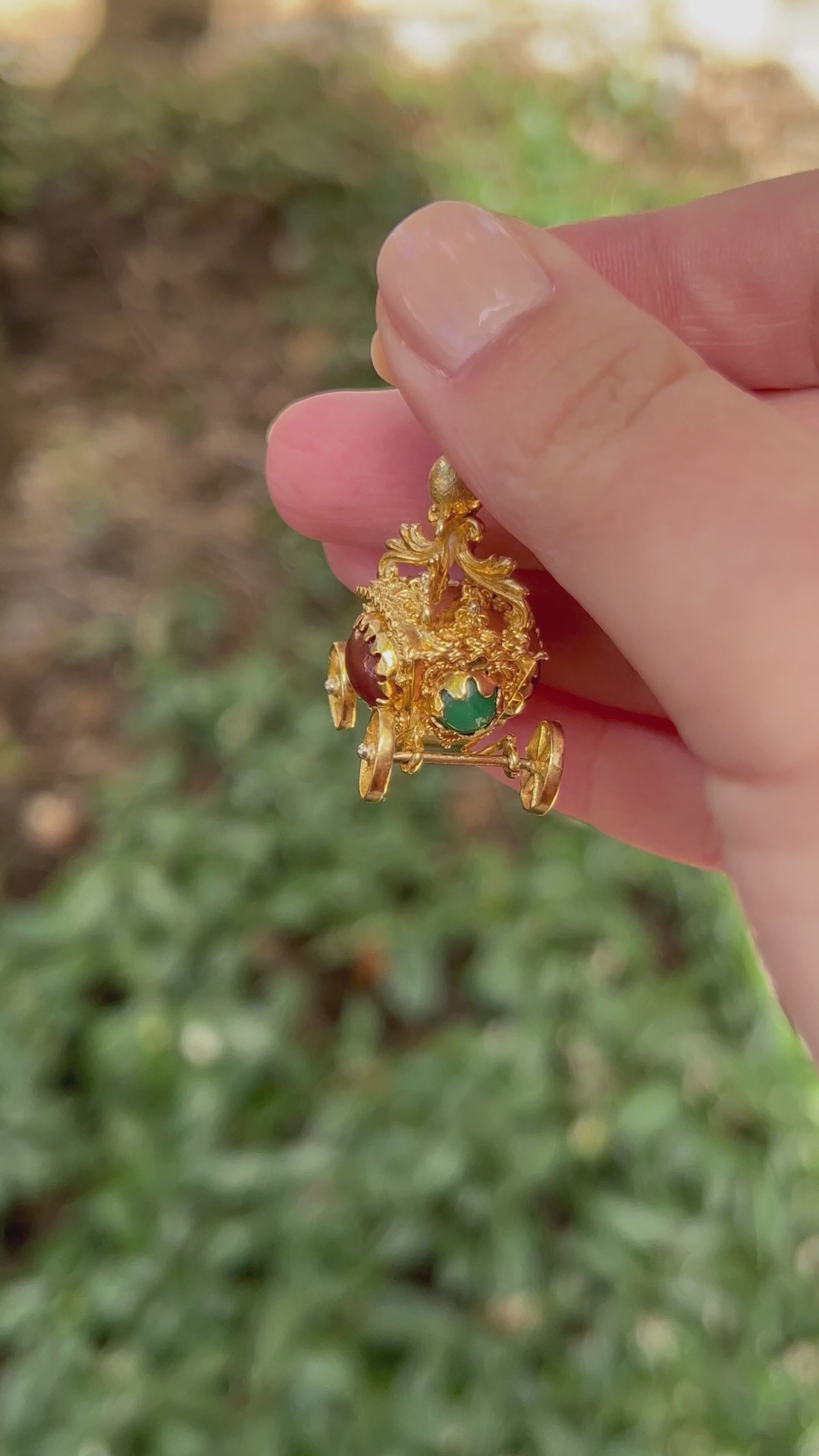 This exquisite vintage 18K yellow gold carriage pendant features two cabochon carnelians and two dyed green chalcedonies. With rotating wheels and a rich color, this piece is sure to add sophistication and a touch of whimsy to any outfit.