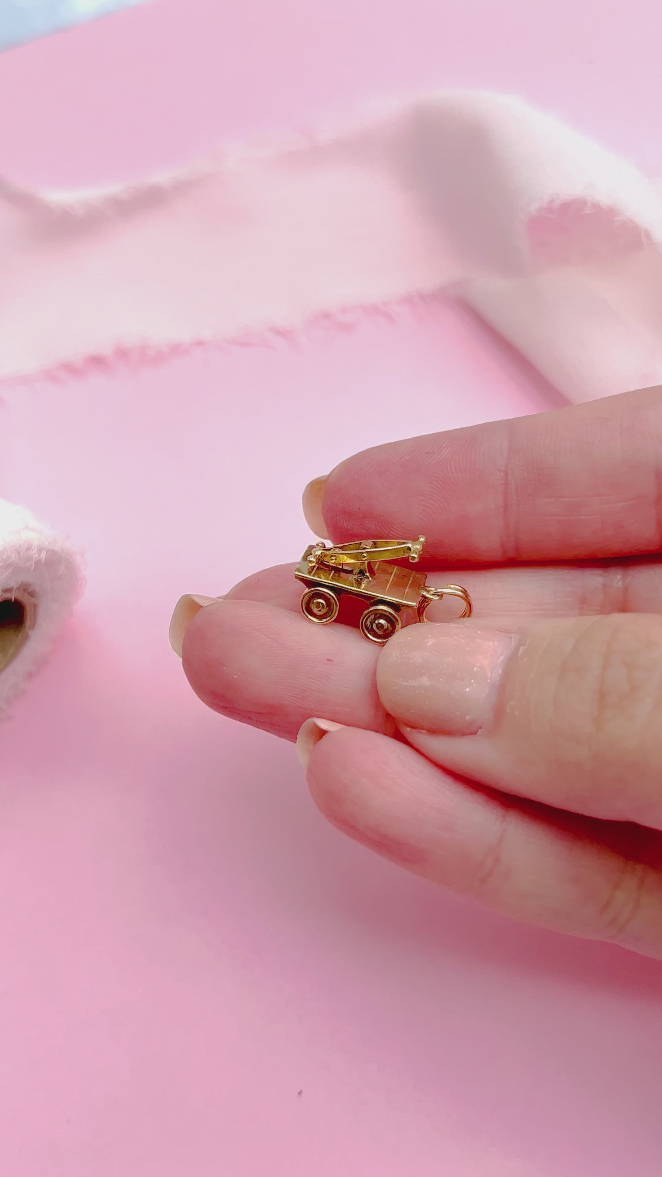 This charm is in good vintage condition. There are a few scratches on the gold and the split ring is new. It functions just like a handcar!