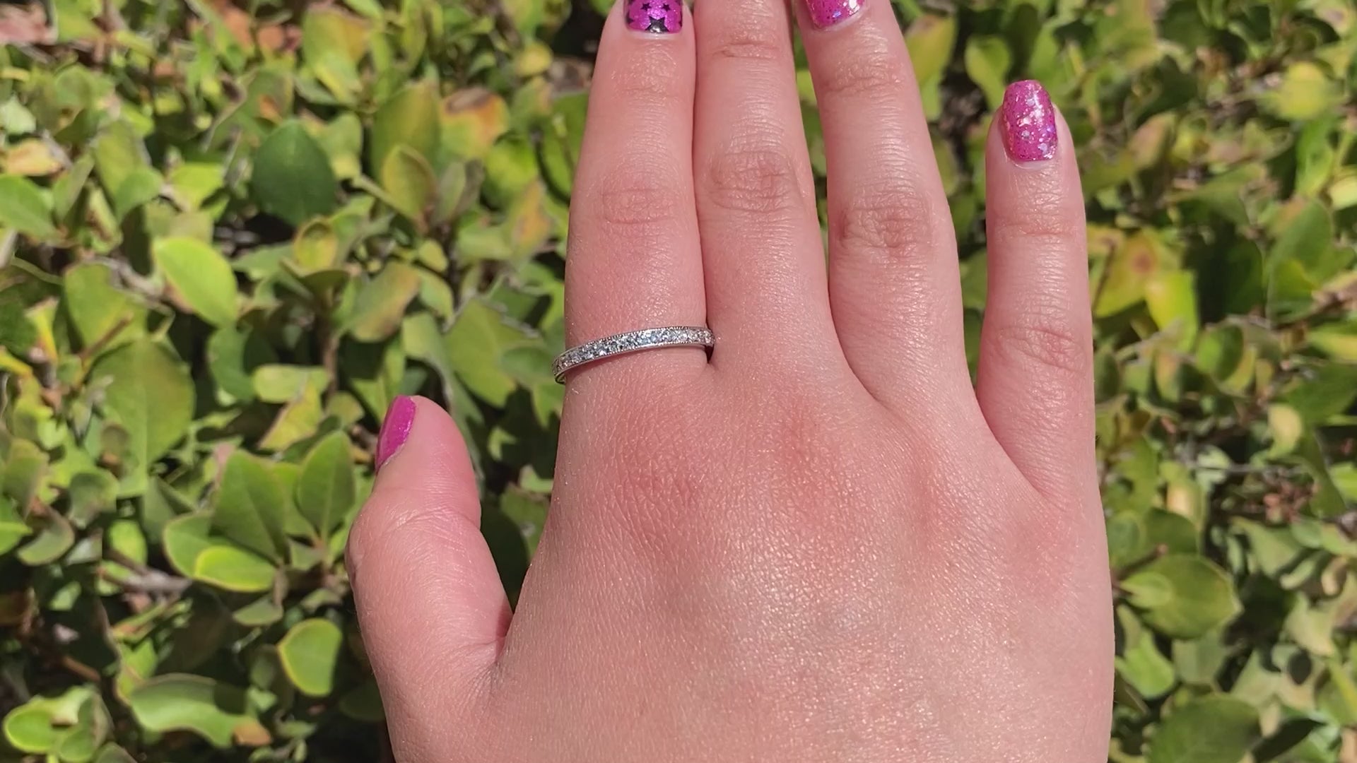 Crafted with exquisite detail and quality, this stunning eternity band features 38 single cut diamonds set in a platinum band. Its intricate design and charming vintage look is sure to make anyone tear up with delight.